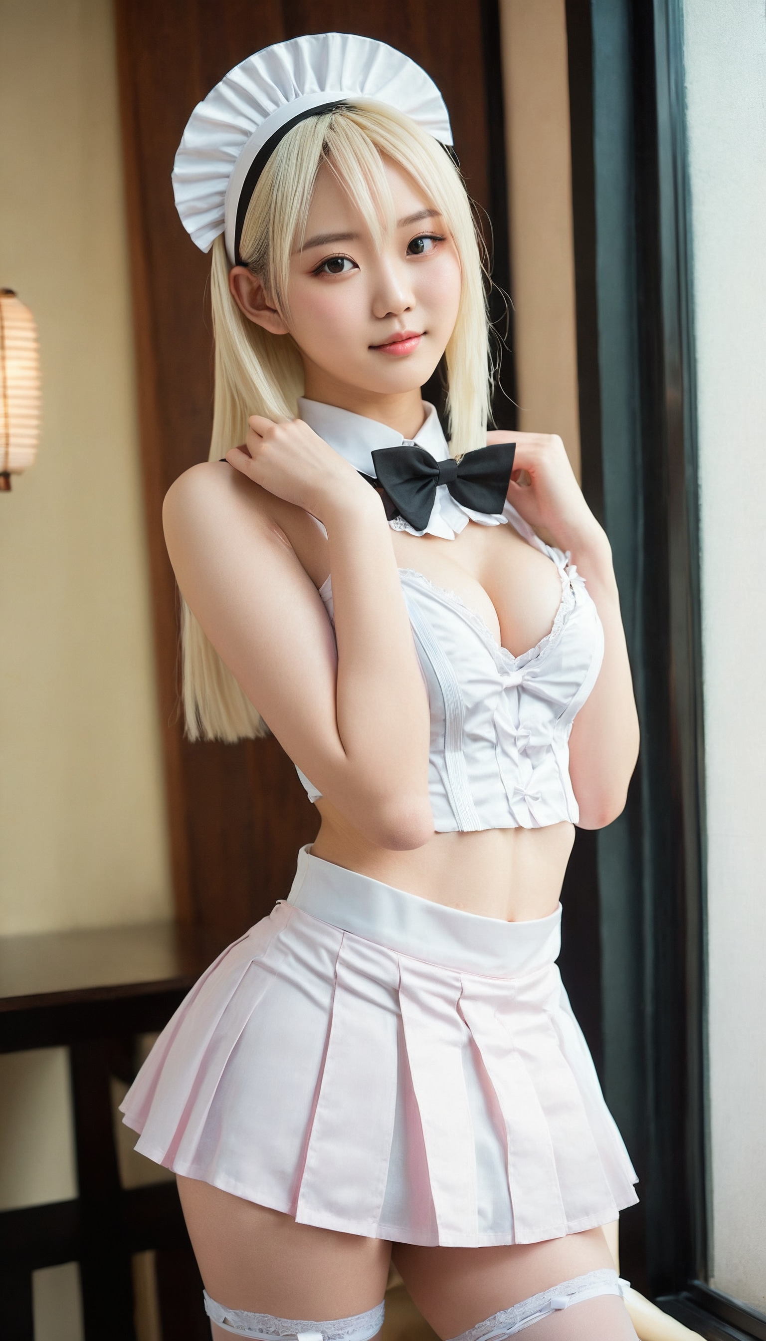 {"3": {"inputs": {"seed": 871095047696193, "steps": 32, "cfg": 7.61, "sampler_name": "dpmpp_2m", "scheduler": "karras", "denoise": 1.0, "model": ["27", 0], "positive": ["6", 0], "negative": ["7", 0], "latent_image": ["5", 0]}, "class_type": "KSampler"}, "4": {"inputs": {"ckpt_name": "juggernautxl.safetensors"}, "class_type": "CheckpointLoaderSimple"}, "5": {"inputs": {"width": 768, "height": 1344, "batch_size": 1}, "class_type": "EmptyLatentImage"}, "6": {"inputs": {"text": "19 year old girl, (taiwanese:0.95), (blush:1.00), (cute:0.96), (seductive facial expression:1.05), (slim:1.09), (detailed face:1.10), (idol:0.96), (pale skin:1.14), (seductive pose:1.01), (sexy lips:1.14), (double eyelids:0.95), (beautiful eyes:1.04), (temptress:0.95), (in a seductive pose:1.14), (large perky breasts:0.97), (cleavage:0.96), (thigh gap:1.14), in a (skimpy maid costume:1.05) working at a maid cafe, choker, bowtie, headband, pleated skirt, (portra:1.06), (RAW:1.01), (skin fuzz:1.04), (film:1.04), (natural looking skin:1.07), (candid cinema:1.00), (soft lighting:1.04), (detailed skin:1.05), (textured skin:1.06)", "clip": ["27", 1]}, "class_type": "CLIPTextEncode"}, "7": {"inputs": {"text": "(worst quality:1.14), (bad hands:1.07), (twisted:1.05), (low resolution:1.06), (distorted:1.07), (open mouth:1.12), (watermark:1.12)", "clip": ["27", 1]}, "class_type": "CLIPTextEncode"}, "8": {"inputs": {"samples": ["3", 0], "vae": ["4", 2]}, "class_type": "VAEDecode"}, "25": {"inputs": {"lora_name": "nudify_xl.safetensors", "strength_model": 0.2, "strength_clip": 0.19, "model": ["4", 0], "clip": ["4", 1]}, "class_type": "LoraLoader"}, "26": {"inputs": {"lora_name": "shirtlift_SDXL_v2.safetensors", "strength_model": 0.05, "strength_clip": 0.16, "model": ["25", 0], "clip": ["25", 1]}, "class_type": "LoraLoader"}, "27": {"inputs": {"lora_name": "PerfectEyesXL.safetensors", "strength_model": 0.0, "strength_clip": 0.11, "model": ["26", 0], "clip": ["26", 1]}, "class_type": "LoraLoader"}, "30": {"inputs": {"model_name": "4x_NMKD-Superscale-SP_178000_G.pth"}, "class_type": "UpscaleModelLoader"}, "31": {"inputs": {"upscale_model": ["30", 0], "image": ["8", 0]}, "class_type": "ImageUpscaleWithModel"}, "32": {"inputs": {"upscale_method": "lanczos", "scale_by": 0.5, "image": ["31", 0]}, "class_type": "ImageScaleBy"}, "33": {"inputs": {"pixels": ["32", 0], "vae": ["4", 2]}, "class_type": "VAEEncode"}, "34": {"inputs": {"seed": 871095047696193, "steps": 32, "cfg": 7.61, "sampler_name": "dpmpp_2m", "scheduler": "karras", "denoise": 0.3, "model": ["27", 0], "positive": ["6", 0], "negative": ["7", 0], "latent_image": ["33", 0]}, "class_type": "KSampler"}, "36": {"inputs": {"samples": ["34", 0], "vae": ["4", 2]}, "class_type": "VAEDecode"}, "39": {"inputs": {"filename_prefix": "comfyapi-1725384400989", "images": ["36", 0]}, "class_type": "SaveImage"}}