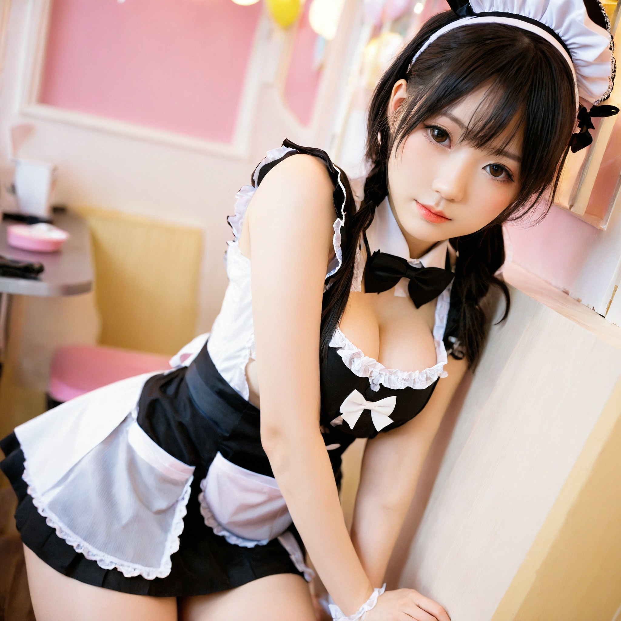 {"3": {"inputs": {"seed": 726713988235667, "steps": 64, "cfg": 6.58, "sampler_name": "dpmpp_2m", "scheduler": "karras", "denoise": 1.0, "model": ["27", 0], "positive": ["6", 0], "negative": ["7", 0], "latent_image": ["5", 0]}, "class_type": "KSampler"}, "4": {"inputs": {"ckpt_name": "helloworldxl.safetensors"}, "class_type": "CheckpointLoaderSimple"}, "5": {"inputs": {"width": 1024, "height": 1024, "batch_size": 1}, "class_type": "EmptyLatentImage"}, "6": {"inputs": {"text": "23 year old girl, (taiwanese:1.06), (eyelashes:1.04), (seductive facial expression:1.08), (pale skin:0.95), (sexy lips:1.00), (seductive pose:1.06), (detailed face:0.98), (blush:1.06), (temptress:0.95), (cute:0.96), (idol:1.05), (double eyelids:1.03), (perky ass:1.06), (exposed ass:1.10), (looking back:1.10), (sexy ass:0.98), (thigh gap:1.02), in a (skimpy maid costume:1.12) working at a maid cafe, choker, bowtie, headband, pleated skirt, (RAW:1.02), (film:1.00), (soft lighting:1.02), (candid cinema:1.03), (textured skin:1.03), (natural looking skin:1.05), (detailed skin:1.01), (portra:1.07), (skin fuzz:1.08)", "clip": ["27", 1]}, "class_type": "CLIPTextEncode"}, "7": {"inputs": {"text": "(worst quality:1.09), (distorted:1.12), (low resolution:1.09), (twisted:1.11), (open mouth:1.13), (watermark:1.13), (bad hands:1.10)", "clip": ["27", 1]}, "class_type": "CLIPTextEncode"}, "8": {"inputs": {"samples": ["3", 0], "vae": ["4", 2]}, "class_type": "VAEDecode"}, "25": {"inputs": {"lora_name": "nudify_xl.safetensors", "strength_model": 0.12, "strength_clip": 0.21, "model": ["4", 0], "clip": ["4", 1]}, "class_type": "LoraLoader"}, "26": {"inputs": {"lora_name": "shirtlift_SDXL_v2.safetensors", "strength_model": 0.1, "strength_clip": 0.08, "model": ["25", 0], "clip": ["25", 1]}, "class_type": "LoraLoader"}, "27": {"inputs": {"lora_name": "PerfectEyesXL.safetensors", "strength_model": 0.17, "strength_clip": 0.13, "model": ["26", 0], "clip": ["26", 1]}, "class_type": "LoraLoader"}, "30": {"inputs": {"model_name": "4x_NMKD-Superscale-SP_178000_G.pth"}, "class_type": "UpscaleModelLoader"}, "31": {"inputs": {"upscale_model": ["30", 0], "image": ["8", 0]}, "class_type": "ImageUpscaleWithModel"}, "32": {"inputs": {"upscale_method": "lanczos", "scale_by": 0.5, "image": ["31", 0]}, "class_type": "ImageScaleBy"}, "33": {"inputs": {"pixels": ["32", 0], "vae": ["4", 2]}, "class_type": "VAEEncode"}, "34": {"inputs": {"seed": 726713988235667, "steps": 64, "cfg": 6.58, "sampler_name": "dpmpp_2m", "scheduler": "karras", "denoise": 0.3, "model": ["27", 0], "positive": ["6", 0], "negative": ["7", 0], "latent_image": ["33", 0]}, "class_type": "KSampler"}, "36": {"inputs": {"samples": ["34", 0], "vae": ["4", 2]}, "class_type": "VAEDecode"}, "39": {"inputs": {"filename_prefix": "comfyapi-1713930322484", "images": ["36", 0]}, "class_type": "SaveImage"}}