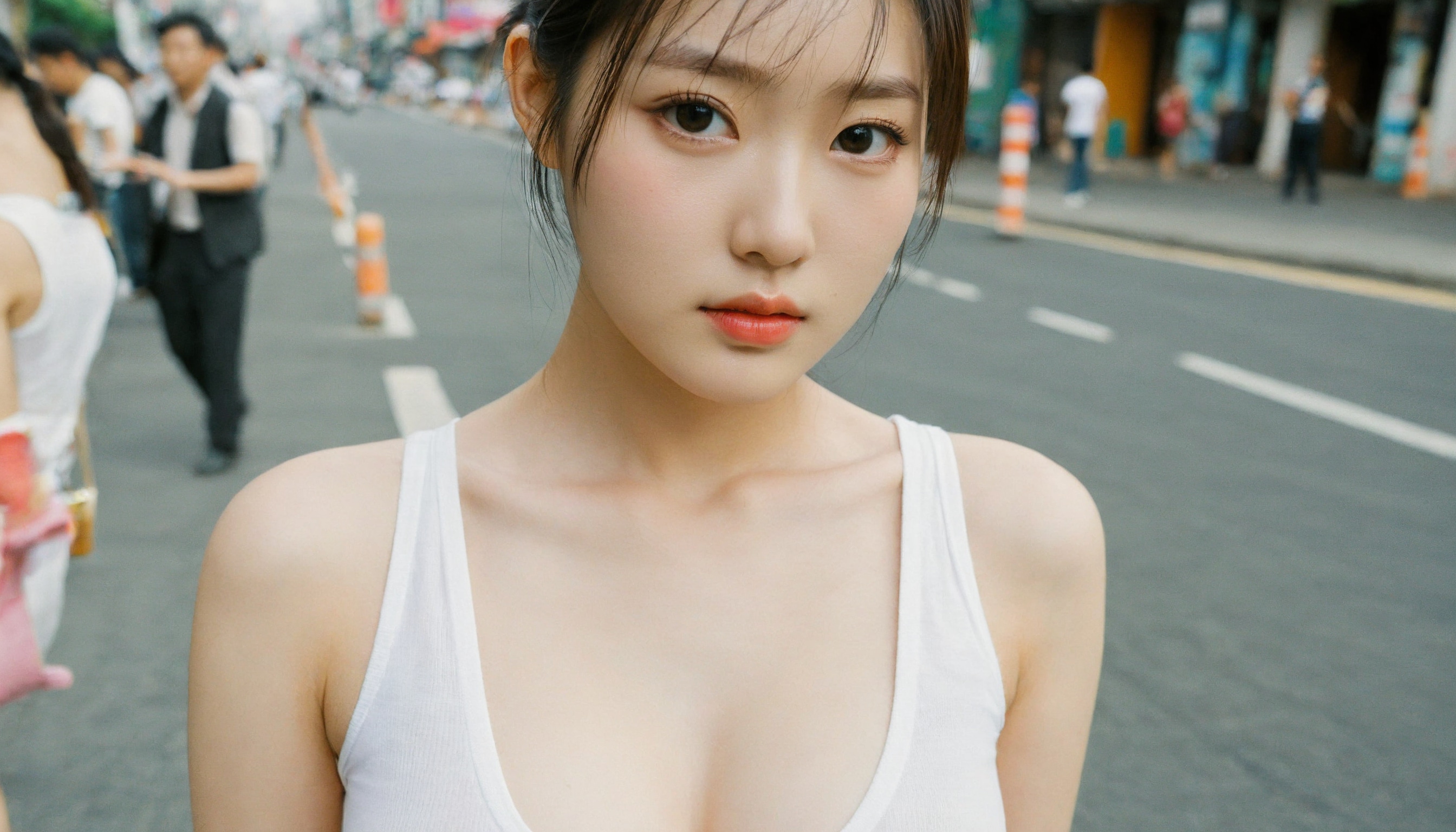 {"3": {"inputs": {"seed": 572208801968481, "steps": 64, "cfg": 5.38, "sampler_name": "dpmpp_2m", "scheduler": "karras", "denoise": 1.0, "model": ["27", 0], "positive": ["6", 0], "negative": ["7", 0], "latent_image": ["5", 0]}, "class_type": "KSampler"}, "4": {"inputs": {"ckpt_name": "helloworldxl.safetensors"}, "class_type": "CheckpointLoaderSimple"}, "5": {"inputs": {"width": 1344, "height": 768, "batch_size": 1}, "class_type": "EmptyLatentImage"}, "6": {"inputs": {"text": "18 year old girl, (korean:1.07), (sexy lips:0.97), (detailed face:1.12), (eyelashes:1.06), (temptress:1.04), (beautiful eyes:1.06), (idol:1.02), (pale skin:1.05), (blush:1.02), (double eyelids:1.05), (seductive pose:0.97), (seductive facial expression:0.96), (cute:1.07), (in a seductive pose:1.04), (large perky breasts:0.99), (cleavage:1.02), (thigh gap:1.11), (white tanktop:1.08), busy street, (film:1.04), (skin fuzz:1.02), (candid cinema:1.00), (RAW:1.05), (portra:1.02), (soft lighting:1.05), (detailed skin:1.04), (natural looking skin:1.05), (textured skin:1.03)", "clip": ["27", 1]}, "class_type": "CLIPTextEncode"}, "7": {"inputs": {"text": "(worst quality:1.08), (open mouth:1.10), (distorted:1.10), (twisted:1.05), (watermark:1.14), (bad hands:1.09), (low resolution:1.09)", "clip": ["27", 1]}, "class_type": "CLIPTextEncode"}, "8": {"inputs": {"samples": ["3", 0], "vae": ["4", 2]}, "class_type": "VAEDecode"}, "25": {"inputs": {"lora_name": "nudify_xl.safetensors", "strength_model": 0.19, "strength_clip": 0.05, "model": ["4", 0], "clip": ["4", 1]}, "class_type": "LoraLoader"}, "26": {"inputs": {"lora_name": "shirtlift_SDXL_v2.safetensors", "strength_model": 0.01, "strength_clip": 0.0, "model": ["25", 0], "clip": ["25", 1]}, "class_type": "LoraLoader"}, "27": {"inputs": {"lora_name": "PerfectEyesXL.safetensors", "strength_model": 0.14, "strength_clip": 0.08, "model": ["26", 0], "clip": ["26", 1]}, "class_type": "LoraLoader"}, "30": {"inputs": {"model_name": "4x_NMKD-Superscale-SP_178000_G.pth"}, "class_type": "UpscaleModelLoader"}, "31": {"inputs": {"upscale_model": ["30", 0], "image": ["8", 0]}, "class_type": "ImageUpscaleWithModel"}, "32": {"inputs": {"upscale_method": "lanczos", "scale_by": 0.5, "image": ["31", 0]}, "class_type": "ImageScaleBy"}, "33": {"inputs": {"pixels": ["32", 0], "vae": ["4", 2]}, "class_type": "VAEEncode"}, "34": {"inputs": {"seed": 572208801968481, "steps": 64, "cfg": 5.38, "sampler_name": "dpmpp_2m", "scheduler": "karras", "denoise": 0.3, "model": ["27", 0], "positive": ["6", 0], "negative": ["7", 0], "latent_image": ["33", 0]}, "class_type": "KSampler"}, "36": {"inputs": {"samples": ["34", 0], "vae": ["4", 2]}, "class_type": "VAEDecode"}, "39": {"inputs": {"filename_prefix": "comfyapi-1717608987410", "images": ["36", 0]}, "class_type": "SaveImage"}}