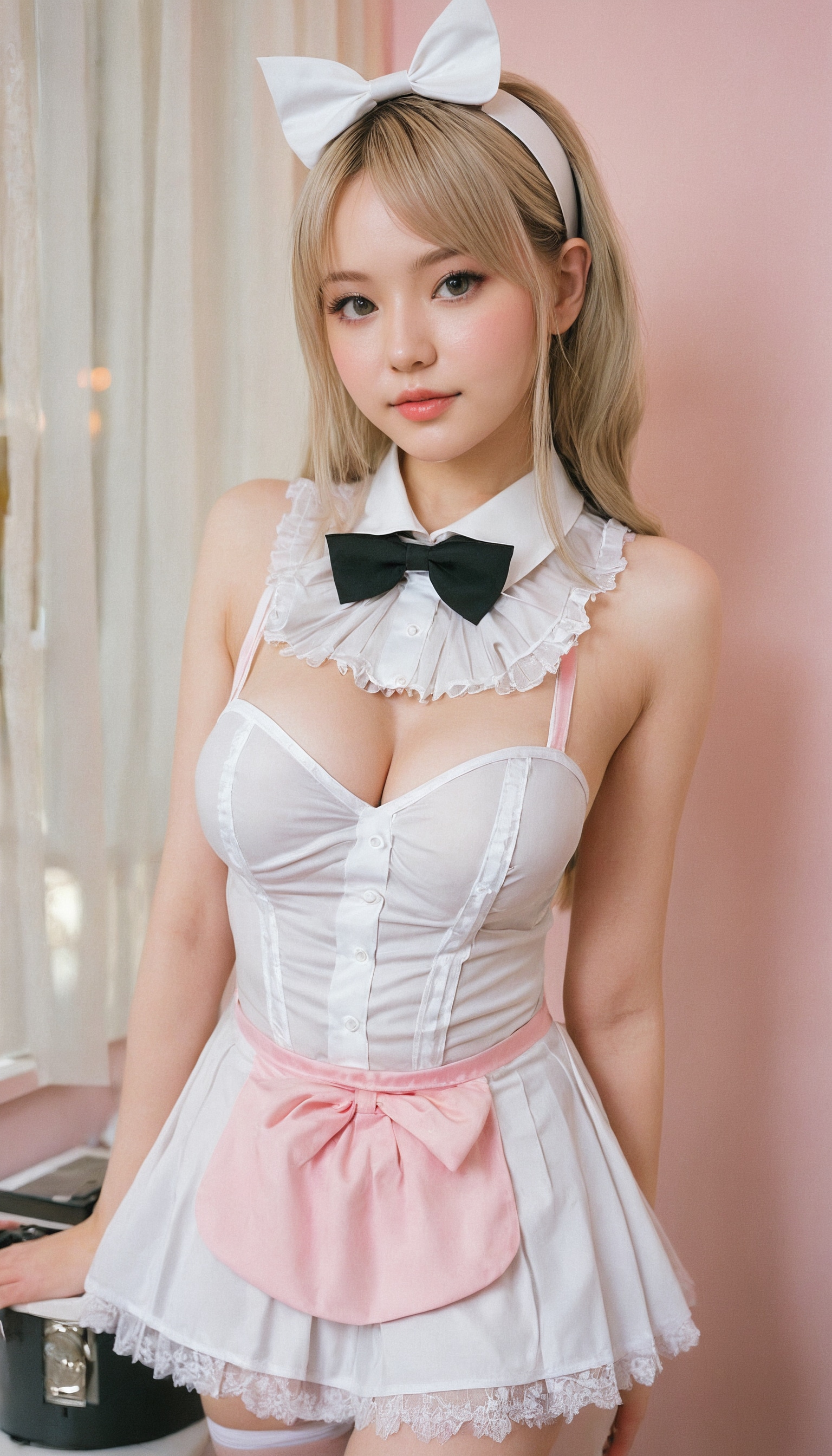 {"3": {"inputs": {"seed": 104722540315101, "steps": 32, "cfg": 5.51, "sampler_name": "dpmpp_2m", "scheduler": "karras", "denoise": 1.0, "model": ["27", 0], "positive": ["6", 0], "negative": ["7", 0], "latent_image": ["5", 0]}, "class_type": "KSampler"}, "4": {"inputs": {"ckpt_name": "juggernautxl.safetensors"}, "class_type": "CheckpointLoaderSimple"}, "5": {"inputs": {"width": 768, "height": 1344, "batch_size": 1}, "class_type": "EmptyLatentImage"}, "6": {"inputs": {"text": "19 year old girl, (slim:1.13), (sexy lips:1.11), (blush:1.05), (idol:0.97), (temptress:1.10), (detailed face:1.12), (seductive facial expression:1.03), (beautiful eyes:1.00), (cute:1.13), (double eyelids:1.03), (pale skin:0.99), (eyelashes:0.96), (seductive pose:1.01), (in a seductive pose:1.02), (large perky breasts:1.07), (cleavage:1.00), (thigh gap:1.12), in a (skimpy maid costume:1.00) working at a maid cafe, choker, bowtie, headband, pleated skirt, (detailed skin:1.02), (film:1.07), (portra:1.08), (RAW:1.01), (textured skin:1.06), (skin fuzz:1.09), (candid cinema:1.07), (soft lighting:1.07), (natural looking skin:1.01)", "clip": ["27", 1]}, "class_type": "CLIPTextEncode"}, "7": {"inputs": {"text": "(open mouth:1.08), (low resolution:1.07), (bad hands:1.10), (twisted:1.09), (worst quality:1.08), (watermark:1.14), (distorted:1.09)", "clip": ["27", 1]}, "class_type": "CLIPTextEncode"}, "8": {"inputs": {"samples": ["3", 0], "vae": ["4", 2]}, "class_type": "VAEDecode"}, "25": {"inputs": {"lora_name": "nudify_xl.safetensors", "strength_model": 0.12, "strength_clip": 0.14, "model": ["4", 0], "clip": ["4", 1]}, "class_type": "LoraLoader"}, "26": {"inputs": {"lora_name": "shirtlift_SDXL_v2.safetensors", "strength_model": 0.06, "strength_clip": 0.08, "model": ["25", 0], "clip": ["25", 1]}, "class_type": "LoraLoader"}, "27": {"inputs": {"lora_name": "PerfectEyesXL.safetensors", "strength_model": 0.0, "strength_clip": 0.17, "model": ["26", 0], "clip": ["26", 1]}, "class_type": "LoraLoader"}, "30": {"inputs": {"model_name": "4x_NMKD-Superscale-SP_178000_G.pth"}, "class_type": "UpscaleModelLoader"}, "31": {"inputs": {"upscale_model": ["30", 0], "image": ["8", 0]}, "class_type": "ImageUpscaleWithModel"}, "32": {"inputs": {"upscale_method": "lanczos", "scale_by": 0.5, "image": ["31", 0]}, "class_type": "ImageScaleBy"}, "33": {"inputs": {"pixels": ["32", 0], "vae": ["4", 2]}, "class_type": "VAEEncode"}, "34": {"inputs": {"seed": 104722540315101, "steps": 32, "cfg": 5.51, "sampler_name": "dpmpp_2m", "scheduler": "karras", "denoise": 0.3, "model": ["27", 0], "positive": ["6", 0], "negative": ["7", 0], "latent_image": ["33", 0]}, "class_type": "KSampler"}, "36": {"inputs": {"samples": ["34", 0], "vae": ["4", 2]}, "class_type": "VAEDecode"}, "39": {"inputs": {"filename_prefix": "comfyapi-1718382504002", "images": ["36", 0]}, "class_type": "SaveImage"}}