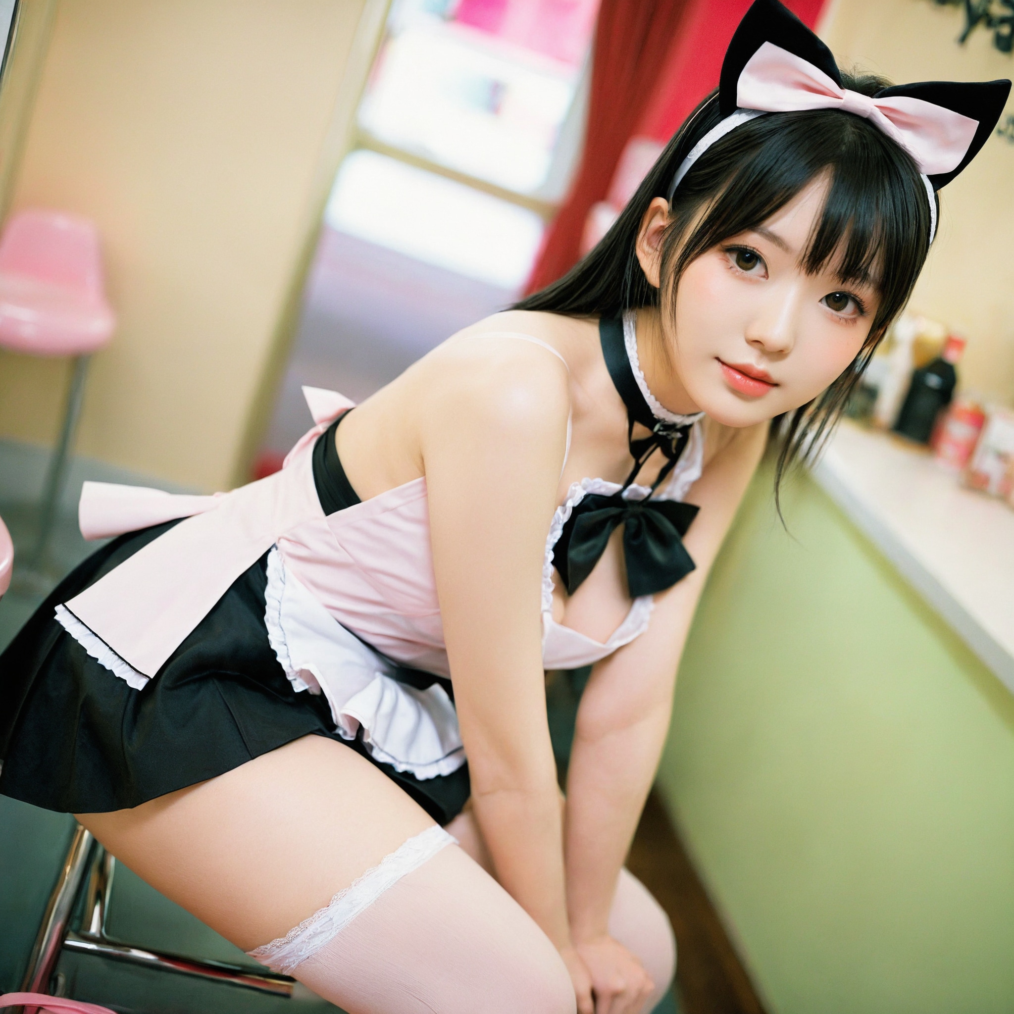 {"3": {"inputs": {"seed": 115483439004501, "steps": 64, "cfg": 7.43, "sampler_name": "dpmpp_2m", "scheduler": "karras", "denoise": 1.0, "model": ["27", 0], "positive": ["6", 0], "negative": ["7", 0], "latent_image": ["5", 0]}, "class_type": "KSampler"}, "4": {"inputs": {"ckpt_name": "helloworldxl.safetensors"}, "class_type": "CheckpointLoaderSimple"}, "5": {"inputs": {"width": 1024, "height": 1024, "batch_size": 1}, "class_type": "EmptyLatentImage"}, "6": {"inputs": {"text": "21 year old girl, (taiwanese:1.14), (double eyelids:0.96), (pale skin:0.99), (detailed face:1.12), (idol:1.05), (cute:1.06), (beautiful eyes:1.06), (seductive pose:1.01), (slim:1.08), (sexy lips:1.06), (temptress:1.08), (blush:1.14), (seductive facial expression:1.09), (eyelashes:0.99), (perky ass:1.08), (exposed ass:0.97), (looking back:1.11), (sexy ass:1.00), (thigh gap:1.14), in a (skimpy maid costume:0.95) working at a maid cafe, choker, bowtie, headband, pleated skirt, (skin fuzz:1.05), (candid cinema:1.09), (textured skin:1.09), (RAW:1.02), (film:1.02), (portra:1.02), (soft lighting:1.09), (detailed skin:1.03), (natural looking skin:1.01)", "clip": ["27", 1]}, "class_type": "CLIPTextEncode"}, "7": {"inputs": {"text": "(watermark:1.10), (worst quality:1.07), (open mouth:1.11), (low resolution:1.11), (twisted:1.14), (bad hands:1.07), (distorted:1.06)", "clip": ["27", 1]}, "class_type": "CLIPTextEncode"}, "8": {"inputs": {"samples": ["3", 0], "vae": ["4", 2]}, "class_type": "VAEDecode"}, "25": {"inputs": {"lora_name": "nudify_xl.safetensors", "strength_model": 0.2, "strength_clip": 0.22, "model": ["4", 0], "clip": ["4", 1]}, "class_type": "LoraLoader"}, "26": {"inputs": {"lora_name": "shirtlift_SDXL_v2.safetensors", "strength_model": 0.1, "strength_clip": 0.18, "model": ["25", 0], "clip": ["25", 1]}, "class_type": "LoraLoader"}, "27": {"inputs": {"lora_name": "PerfectEyesXL.safetensors", "strength_model": 0.0, "strength_clip": 0.07, "model": ["26", 0], "clip": ["26", 1]}, "class_type": "LoraLoader"}, "30": {"inputs": {"model_name": "4x_NMKD-Superscale-SP_178000_G.pth"}, "class_type": "UpscaleModelLoader"}, "31": {"inputs": {"upscale_model": ["30", 0], "image": ["8", 0]}, "class_type": "ImageUpscaleWithModel"}, "32": {"inputs": {"upscale_method": "lanczos", "scale_by": 0.5, "image": ["31", 0]}, "class_type": "ImageScaleBy"}, "33": {"inputs": {"pixels": ["32", 0], "vae": ["4", 2]}, "class_type": "VAEEncode"}, "34": {"inputs": {"seed": 115483439004501, "steps": 64, "cfg": 7.43, "sampler_name": "dpmpp_2m", "scheduler": "karras", "denoise": 0.3, "model": ["27", 0], "positive": ["6", 0], "negative": ["7", 0], "latent_image": ["33", 0]}, "class_type": "KSampler"}, "36": {"inputs": {"samples": ["34", 0], "vae": ["4", 2]}, "class_type": "VAEDecode"}, "39": {"inputs": {"filename_prefix": "comfyapi-1732420127468", "images": ["36", 0]}, "class_type": "SaveImage"}}