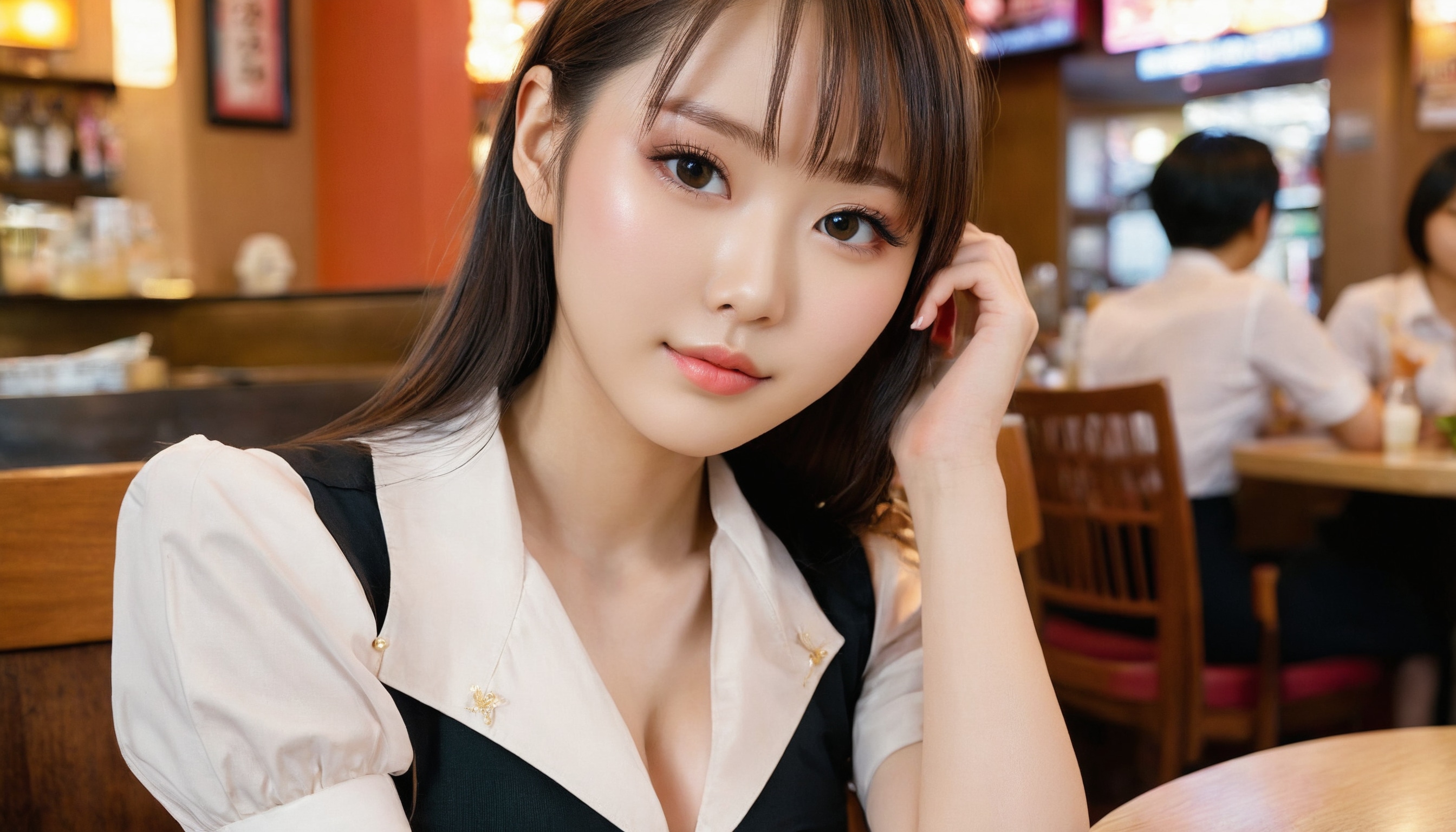 {"3": {"inputs": {"seed": 141815654974005, "steps": 64, "cfg": 5.57, "sampler_name": "dpmpp_2m", "scheduler": "karras", "denoise": 1.0, "model": ["27", 0], "positive": ["6", 0], "negative": ["7", 0], "latent_image": ["5", 0]}, "class_type": "KSampler"}, "4": {"inputs": {"ckpt_name": "juggernautxl.safetensors"}, "class_type": "CheckpointLoaderSimple"}, "5": {"inputs": {"width": 1344, "height": 768, "batch_size": 1}, "class_type": "EmptyLatentImage"}, "6": {"inputs": {"text": "20 year old girl, (japanese:0.98), (blush:1.02), (cute:1.06), (seductive facial expression:0.99), (double eyelids:1.06), (temptress:1.10), (detailed face:1.13), (eyelashes:0.98), (sexy lips:1.06), (slim:0.95), (beautiful eyes:1.00), (pale skin:1.04), (seductive pose:1.05), (idol:1.02), (in a seductive pose:1.05), (large perky breasts:1.14), (cleavage:1.04), (thigh gap:1.06), (a waitress in uniform:1.07) working at a restaurant, (natural looking skin:1.08), (detailed skin:1.07), (portra:1.00), (soft lighting:1.03), (film:1.04), (RAW:1.06), (textured skin:1.01), (skin fuzz:1.00), (candid cinema:1.05)", "clip": ["27", 1]}, "class_type": "CLIPTextEncode"}, "7": {"inputs": {"text": "(watermark:1.13), (open mouth:1.12), (bad hands:1.07), (worst quality:1.09), (twisted:1.14), (distorted:1.09)", "clip": ["27", 1]}, "class_type": "CLIPTextEncode"}, "8": {"inputs": {"samples": ["3", 0], "vae": ["4", 2]}, "class_type": "VAEDecode"}, "25": {"inputs": {"lora_name": "nudify_xl.safetensors", "strength_model": 0.19, "strength_clip": 0.34, "model": ["4", 0], "clip": ["4", 1]}, "class_type": "LoraLoader"}, "26": {"inputs": {"lora_name": "shirtlift_SDXL_v2.safetensors", "strength_model": 0.06, "strength_clip": 0.16, "model": ["25", 0], "clip": ["25", 1]}, "class_type": "LoraLoader"}, "27": {"inputs": {"lora_name": "PerfectEyesXL.safetensors", "strength_model": 0.01, "strength_clip": 0.13, "model": ["26", 0], "clip": ["26", 1]}, "class_type": "LoraLoader"}, "30": {"inputs": {"model_name": "4x_NMKD-Superscale-SP_178000_G.pth"}, "class_type": "UpscaleModelLoader"}, "31": {"inputs": {"upscale_model": ["30", 0], "image": ["8", 0]}, "class_type": "ImageUpscaleWithModel"}, "32": {"inputs": {"upscale_method": "lanczos", "scale_by": 0.5, "image": ["31", 0]}, "class_type": "ImageScaleBy"}, "33": {"inputs": {"pixels": ["32", 0], "vae": ["4", 2]}, "class_type": "VAEEncode"}, "34": {"inputs": {"seed": 141815654974005, "steps": 64, "cfg": 5.57, "sampler_name": "dpmpp_2m", "scheduler": "karras", "denoise": 0.3, "model": ["27", 0], "positive": ["6", 0], "negative": ["7", 0], "latent_image": ["33", 0]}, "class_type": "KSampler"}, "36": {"inputs": {"samples": ["34", 0], "vae": ["4", 2]}, "class_type": "VAEDecode"}, "39": {"inputs": {"filename_prefix": "comfyapi-1733883476154", "images": ["36", 0]}, "class_type": "SaveImage"}}
