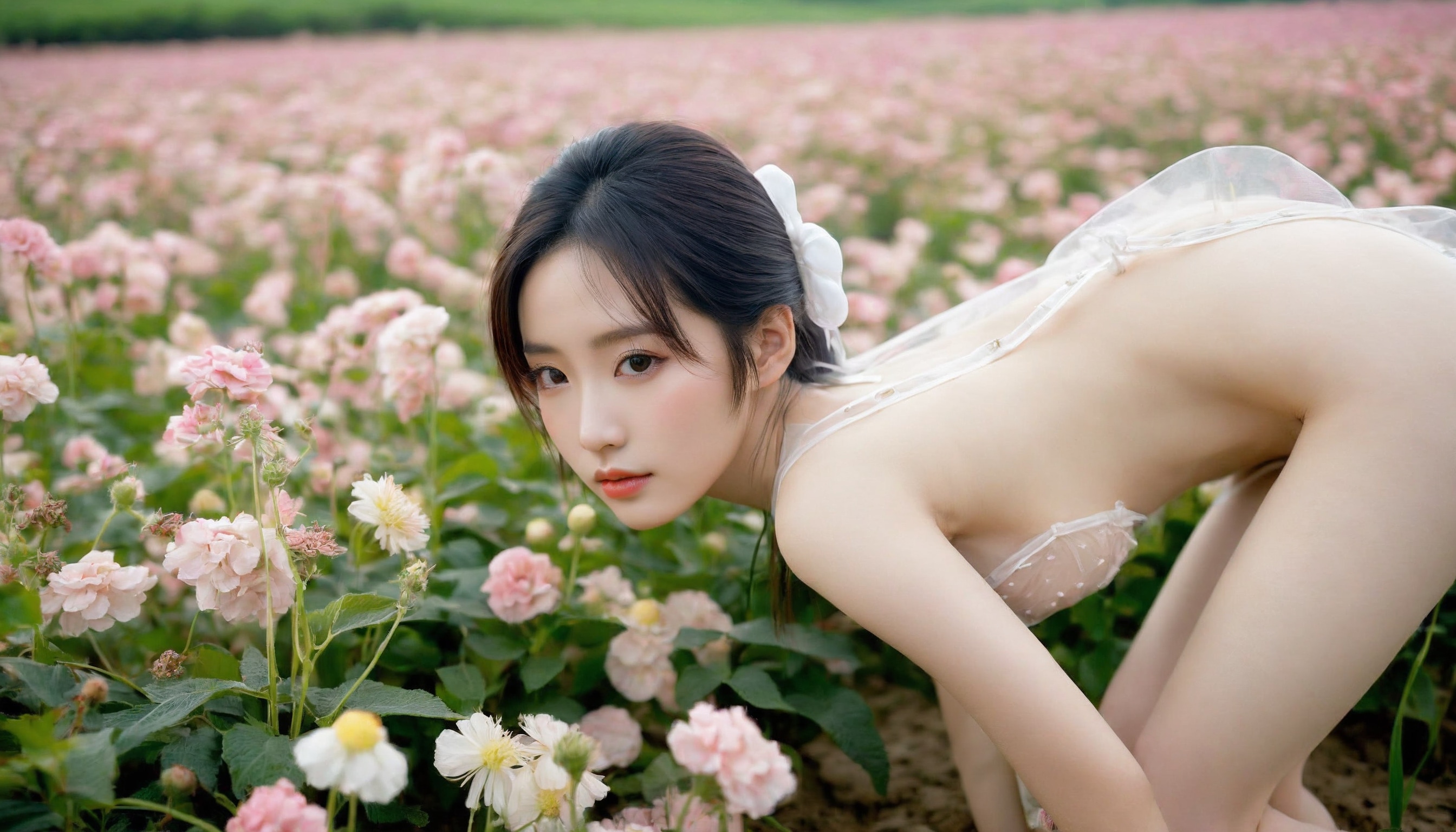{"3": {"inputs": {"seed": 168105436484729, "steps": 64, "cfg": 6.48, "sampler_name": "dpmpp_2m", "scheduler": "karras", "denoise": 1.0, "model": ["27", 0], "positive": ["6", 0], "negative": ["7", 0], "latent_image": ["5", 0]}, "class_type": "KSampler"}, "4": {"inputs": {"ckpt_name": "helloworldxl.safetensors"}, "class_type": "CheckpointLoaderSimple"}, "5": {"inputs": {"width": 1344, "height": 768, "batch_size": 1}, "class_type": "EmptyLatentImage"}, "6": {"inputs": {"text": "21 year old girl, (korean:1.14), (chinese:1.03), (slim:1.05), (beautiful eyes:0.98), (seductive pose:1.09), (detailed face:1.08), (blush:1.00), (temptress:1.09), (seductive facial expression:1.08), (sexy lips:0.97), (eyelashes:1.14), (double eyelids:1.11), (pale skin:1.00), (cute:1.08), (on all fours:1.03), (spreading ass cheeks:1.07), (from behind:1.09), (backboob:0.95), wearing (translucent clothes:1.12) on a flower field, (film:1.04), (skin fuzz:1.07), (RAW:1.07), (detailed skin:1.00), (soft lighting:1.06), (natural looking skin:1.06), (candid cinema:1.09), (portra:1.01)", "clip": ["27", 1]}, "class_type": "CLIPTextEncode"}, "7": {"inputs": {"text": "(open mouth:1.12), (bad hands:1.05), (low resolution:1.08), (distorted:1.09), (twisted:1.14), (watermark:1.14), (worst quality:1.06)", "clip": ["27", 1]}, "class_type": "CLIPTextEncode"}, "8": {"inputs": {"samples": ["3", 0], "vae": ["4", 2]}, "class_type": "VAEDecode"}, "25": {"inputs": {"lora_name": "nudify_xl.safetensors", "strength_model": 0.04, "strength_clip": 0.07, "model": ["4", 0], "clip": ["4", 1]}, "class_type": "LoraLoader"}, "26": {"inputs": {"lora_name": "shirtlift_SDXL_v2.safetensors", "strength_model": 0.14, "strength_clip": 0.15, "model": ["25", 0], "clip": ["25", 1]}, "class_type": "LoraLoader"}, "27": {"inputs": {"lora_name": "PerfectEyesXL.safetensors", "strength_model": 0.01, "strength_clip": 0.0, "model": ["26", 0], "clip": ["26", 1]}, "class_type": "LoraLoader"}, "30": {"inputs": {"model_name": "4x_NMKD-Superscale-SP_178000_G.pth"}, "class_type": "UpscaleModelLoader"}, "31": {"inputs": {"upscale_model": ["30", 0], "image": ["8", 0]}, "class_type": "ImageUpscaleWithModel"}, "32": {"inputs": {"upscale_method": "lanczos", "scale_by": 0.5, "image": ["31", 0]}, "class_type": "ImageScaleBy"}, "33": {"inputs": {"pixels": ["32", 0], "vae": ["4", 2]}, "class_type": "VAEEncode"}, "34": {"inputs": {"seed": 168105436484729, "steps": 64, "cfg": 6.48, "sampler_name": "dpmpp_2m", "scheduler": "karras", "denoise": 0.3, "model": ["27", 0], "positive": ["6", 0], "negative": ["7", 0], "latent_image": ["33", 0]}, "class_type": "KSampler"}, "36": {"inputs": {"samples": ["34", 0], "vae": ["4", 2]}, "class_type": "VAEDecode"}, "39": {"inputs": {"filename_prefix": "comfyapi-1718916983105", "images": ["36", 0]}, "class_type": "SaveImage"}}