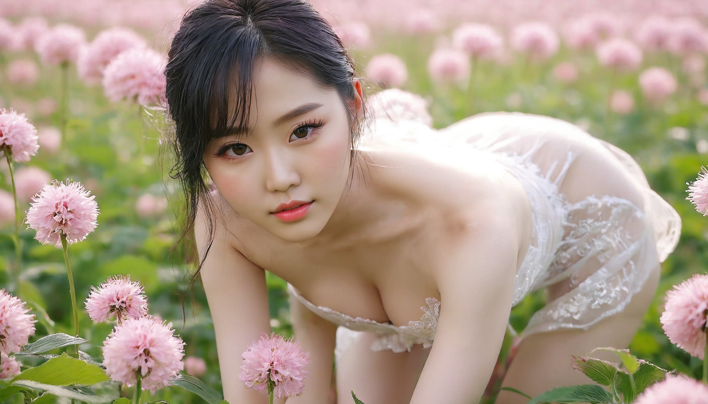 {"3": {"inputs": {"seed": 223253368658935, "steps": 64, "cfg": 7.4, "sampler_name": "dpmpp_2m", "scheduler": "karras", "denoise": 1.0, "model": ["27", 0], "positive": ["6", 0], "negative": ["7", 0], "latent_image": ["5", 0]}, "class_type": "KSampler"}, "4": {"inputs": {"ckpt_name": "juggernautxl.safetensors"}, "class_type": "CheckpointLoaderSimple"}, "5": {"inputs": {"width": 1344, "height": 768, "batch_size": 1}, "class_type": "EmptyLatentImage"}, "6": {"inputs": {"text": "24 year old girl, (korean:1.10), (temptress:1.05), (seductive pose:1.03), (sexy lips:1.13), (beautiful eyes:1.04), (seductive facial expression:1.02), (detailed face:0.96), (idol:0.96), (pale skin:1.03), (cute:0.96), (slim:1.05), (double eyelids:0.98), (eyelashes:1.11), (on all fours:0.96), (spreading ass cheeks:1.08), (from behind:0.99), (backboob:1.13), wearing (translucent clothes:1.00) on a flower field, (natural looking skin:1.08), (RAW:1.02), (film:1.07), (portra:1.00), (textured skin:1.05), (soft lighting:1.02), (detailed skin:1.05), (candid cinema:1.06), (skin fuzz:1.02)", "clip": ["27", 1]}, "class_type": "CLIPTextEncode"}, "7": {"inputs": {"text": "(worst quality:1.09), (bad hands:1.12), (distorted:1.07), (twisted:1.07), (open mouth:1.10), (watermark:1.11), (low resolution:1.07)", "clip": ["27", 1]}, "class_type": "CLIPTextEncode"}, "8": {"inputs": {"samples": ["3", 0], "vae": ["4", 2]}, "class_type": "VAEDecode"}, "25": {"inputs": {"lora_name": "nudify_xl.safetensors", "strength_model": 0.09, "strength_clip": 0.12, "model": ["4", 0], "clip": ["4", 1]}, "class_type": "LoraLoader"}, "26": {"inputs": {"lora_name": "shirtlift_SDXL_v2.safetensors", "strength_model": 0.07, "strength_clip": 0.03, "model": ["25", 0], "clip": ["25", 1]}, "class_type": "LoraLoader"}, "27": {"inputs": {"lora_name": "PerfectEyesXL.safetensors", "strength_model": 0.19, "strength_clip": 0.19, "model": ["26", 0], "clip": ["26", 1]}, "class_type": "LoraLoader"}, "30": {"inputs": {"model_name": "4x_NMKD-Superscale-SP_178000_G.pth"}, "class_type": "UpscaleModelLoader"}, "31": {"inputs": {"upscale_model": ["30", 0], "image": ["8", 0]}, "class_type": "ImageUpscaleWithModel"}, "32": {"inputs": {"upscale_method": "lanczos", "scale_by": 0.5, "image": ["31", 0]}, "class_type": "ImageScaleBy"}, "33": {"inputs": {"pixels": ["32", 0], "vae": ["4", 2]}, "class_type": "VAEEncode"}, "34": {"inputs": {"seed": 223253368658935, "steps": 64, "cfg": 7.4, "sampler_name": "dpmpp_2m", "scheduler": "karras", "denoise": 0.3, "model": ["27", 0], "positive": ["6", 0], "negative": ["7", 0], "latent_image": ["33", 0]}, "class_type": "KSampler"}, "36": {"inputs": {"samples": ["34", 0], "vae": ["4", 2]}, "class_type": "VAEDecode"}, "39": {"inputs": {"filename_prefix": "comfyapi-1716635722663", "images": ["36", 0]}, "class_type": "SaveImage"}}